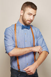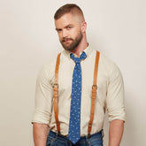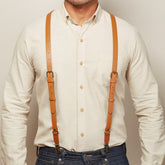 These leather suspenders are .75" wide with a leather cross patch in the back which has the discreet Blade + Blue logo embossing.