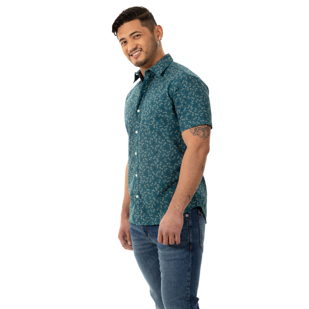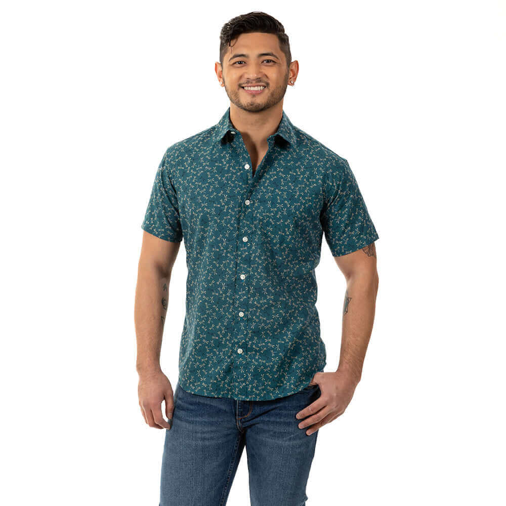 TEDDY Short Sleeve Shirt in Teal Green Japanese Dragonfly Print