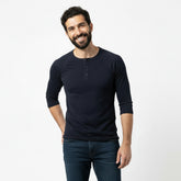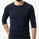 Solid Black Cotton 3/4 Raglan Sleeve Henley - Made in USA