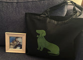 This tote is made of 100% cotton and measures 13" tall x 16" wide with a 12" shoulder strap.